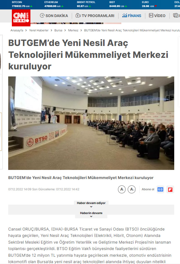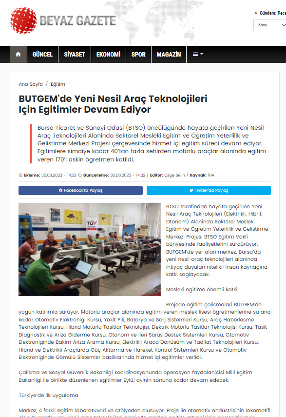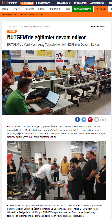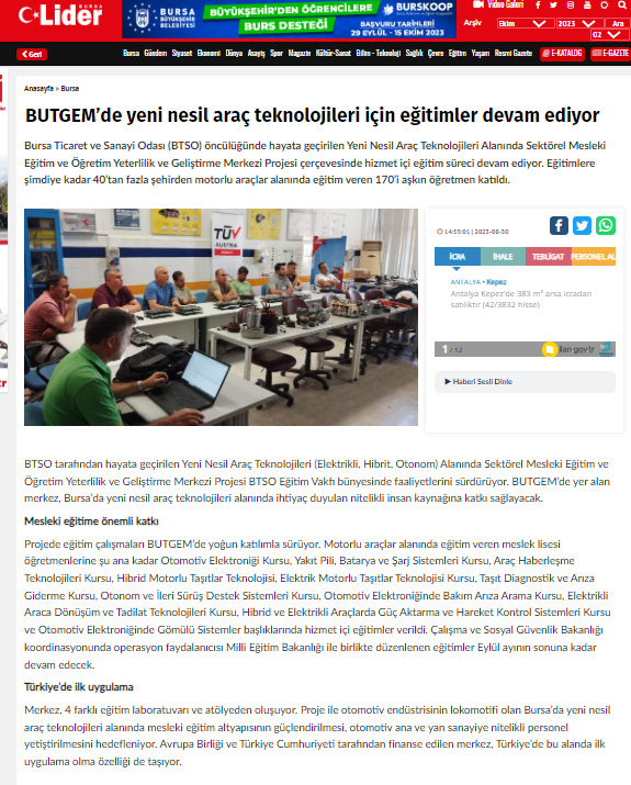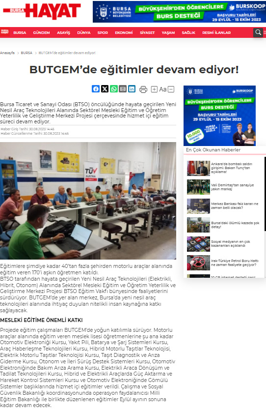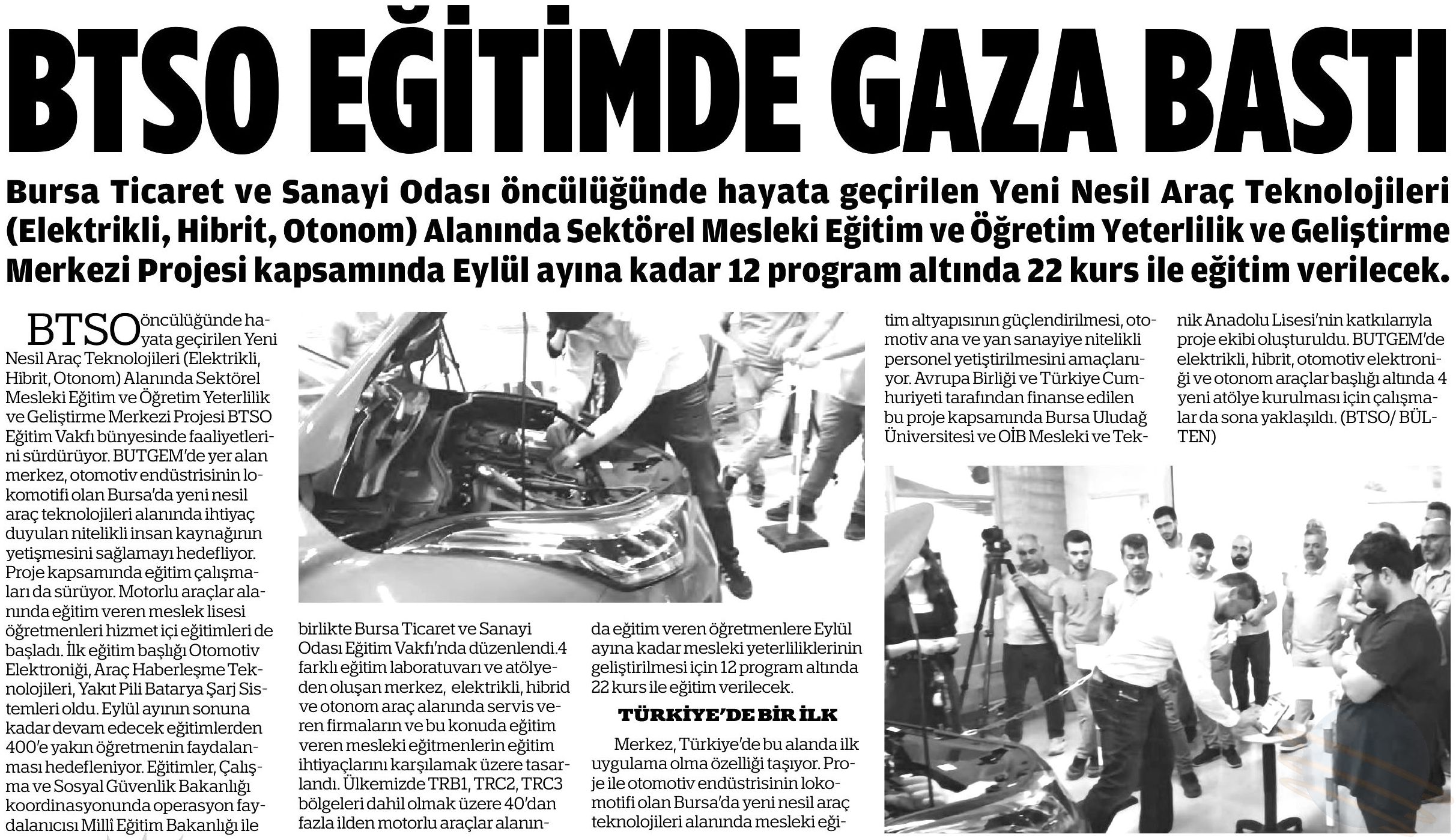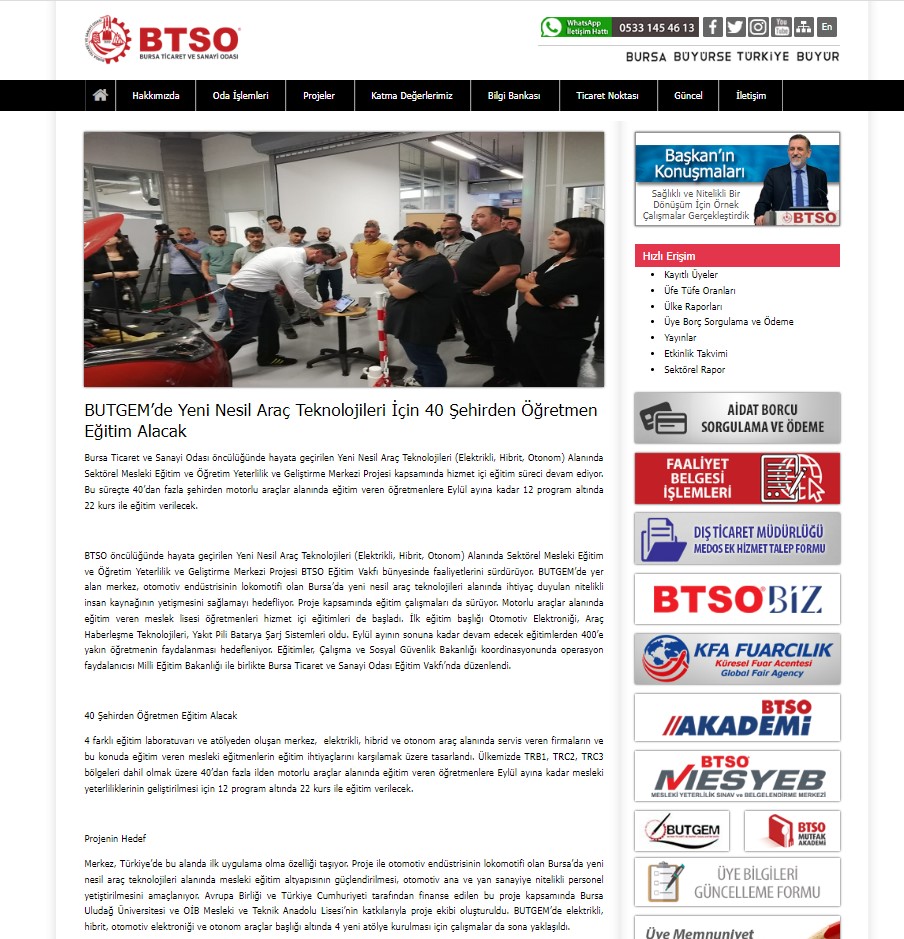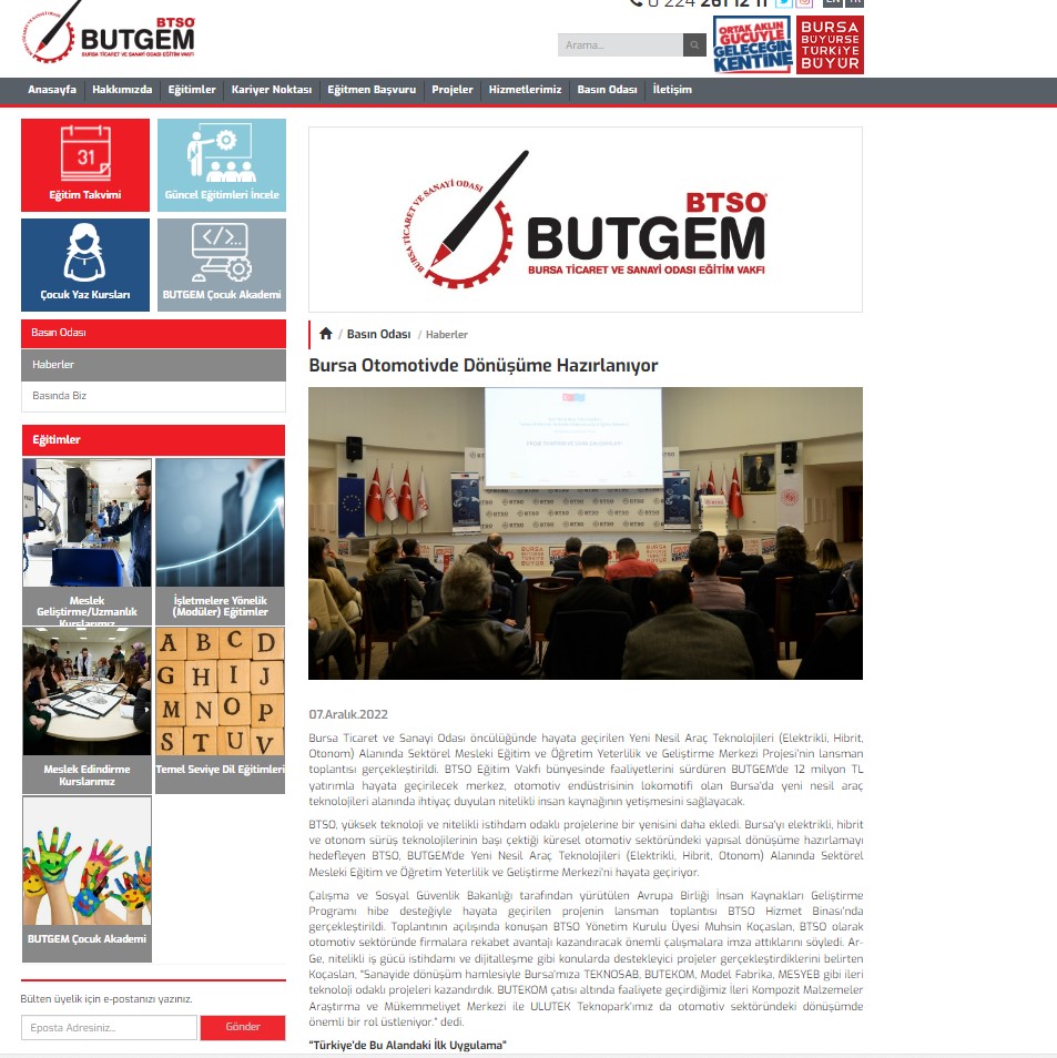 Bu proje, BTSO tarafından BTSO Eğitim Vakfı-(BUTGEM)’de Yeni Nesil Araç teknolojileri (Elektrikli, Hibrit, Otonom) alanında Sektörel Mükemmeliyet Merkezinin kurulması, mevcut eğitim altyapısının güçlendirilmesi, Yeni Nesil Araç teknolojilerine ait Hizmet içi eğitim programları ve eğitim materyalleri hazırlanması, Meslek öğretmenlerinin karma eğitim modeli ile kapasitesinin güçlendirilmesi ve Toplumda Mesleki eğitimin farkındalığını artıracak faaliyetlerin iş dünyası tarafından organize edilmesi ile kurumun mesleki eğitim paydaşları arasında işbirliği kapasitesinin artırılması amaçlanmaktadır.Proje ile BTSO Eğitim Vakfı – BUTGEM’de bu ihtiyaçlara yönelik Yeni Nesil Araç Teknolojilerine ait aşağıdaki konu başlıkları altında hizmetiçi eğitim programları gerçekleştirilecek ve Atelye ve laboratuvarlar kurulacaktır.